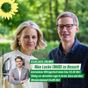 Der Bundestagsabgeordnete Max Lucks (Bündnis 90/Die Grünen) wird am 3. September 2025 Dülmen besuchen und gemeinsam mit den Grünen verschiedene Wahlkampfaktivitäten durchführen. Der Besuch ist Teil einer Reihe von Veranstaltungen der Grünen im Vorfeld der kommenden Wahlen.