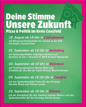 Deine Stimme gestaltet UNSERE Zukunft! Bei leckerer Pizza ins Gespräch kommen und mehr über grüne Politik erfahren - das geht bei unseren Events im ganzen Kreis Coesfeld!