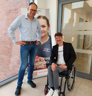 Einen sprichwörtlich bunten Blumenstrauß an Themen überreichte der Kreisvorsitzende des DRK Coesfeld, Christoph Schlütermann, zum Antrittsbesuch dem Landtagsabgeordneten Dennis Sonne in den Räumen des DRK Kreis Coesfeld. Nach einem Jahr wurde das auch Zeit – beide freuten sich über den Termin, denn sie kennen sich aus Lüdinghausen. Christoph Schlütermann stellte beim Treffen das große Spektrum der Arbeit des DRK vor: es reicht vom Sanitäts- und Rettungsdienst über Blutspende und Katastrophenschutz bis hin zum Betrieb von Kindertageseinrichtungen. In den letzten Jahren ist auch Themenfeld Flucht und Migration verstärkt hinzugekommen.